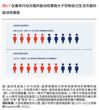 第三,我们需要缩小能动性差距,这在一定程度上是因为人们认为的合理性或可能性与客观的可能性之间存在分歧。能动性差距也很明显,全世界一半的人表示,他们对自己的生活没有控制力或只有有限的控制力,超过三分之二的人认为他们对政府的决定几乎没有影响力(图S.7)。