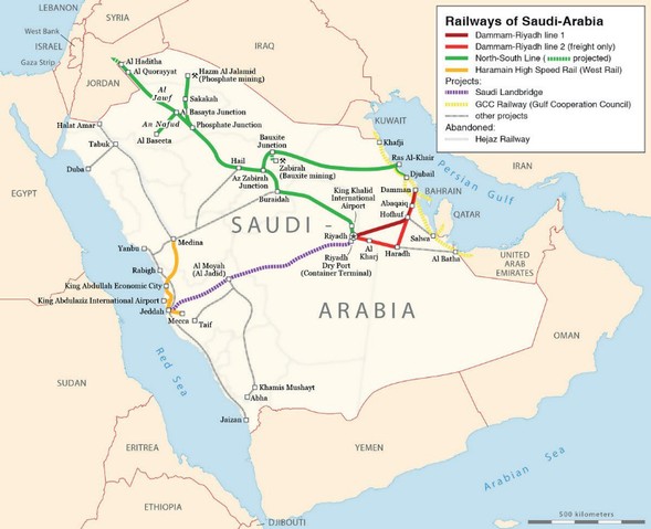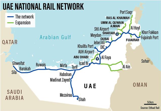 另一方面,阿联酋、沙特、约旦和以色列之间的铁路网联通还需更多投入。在阿联酋(图1),阿提哈德铁路网贯通包括杰贝阿里港和哈利法港在内的西岸地区,西南向延伸至与沙特接壤的格威法特。沙特的铁路