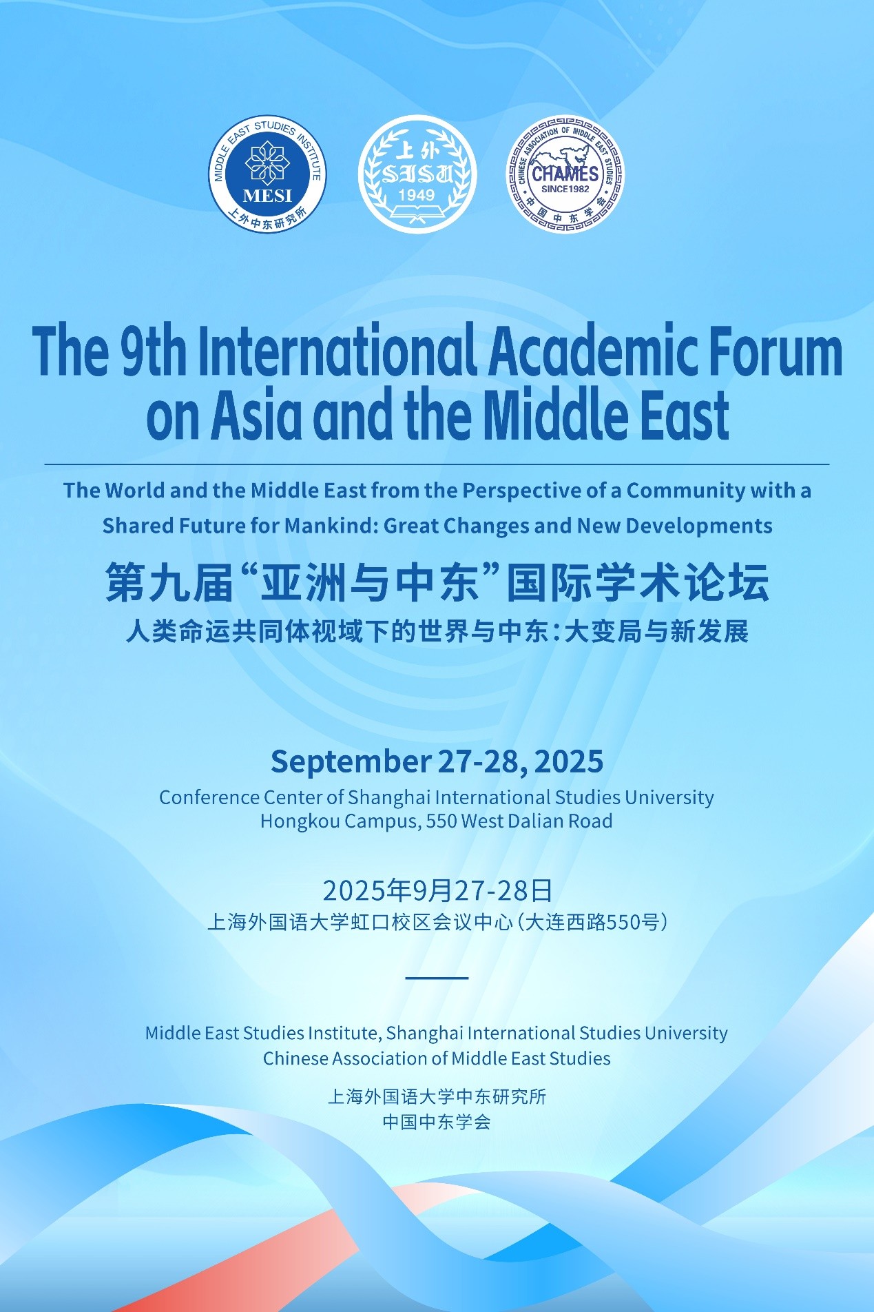 为深入贯彻党的二十届三中全会精神,加强国际交流,深化学术研究,上海外国语大学将于2025年9月27日-28日举办第九届“亚洲与中东”国际学术论坛,本届论坛由上海外国语大学中东研究所和中国中东学会联合主办,论坛主题为“人类命运共同体视域下的世界与中东:大变局与新发展”。