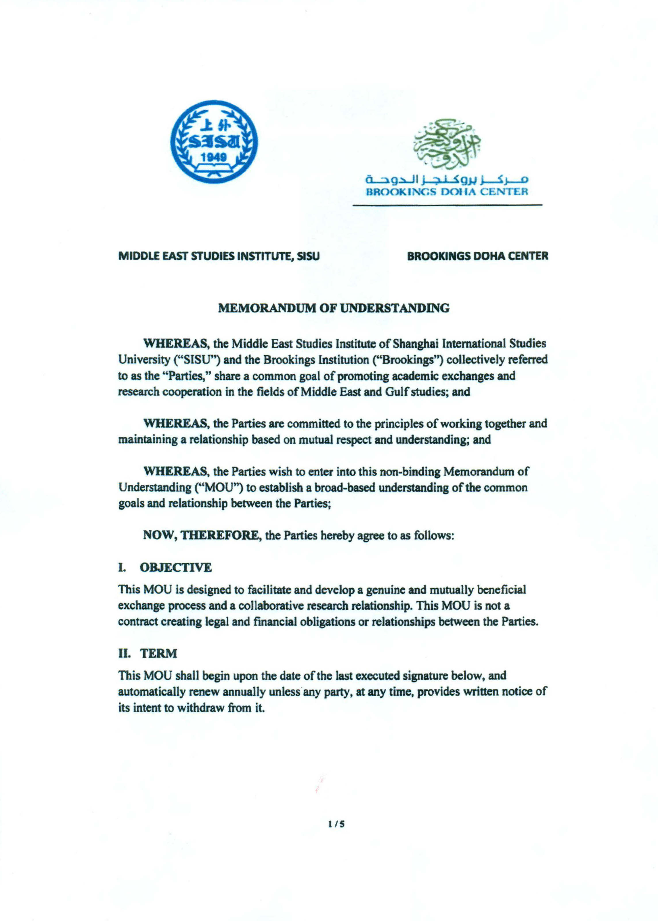 2015年7月14日,上海外国语大学中东研究所与布鲁金斯学会多哈中心签订了合作谅解备忘录(MOU)。根据协议内容,今后双方将在智库层面开展多方面的合作,如联合举办国际研讨会、研究人员互访、政策文件合作研究、在国际顶尖期刊发表合作论文、提升对当代海湾和大中东地区热点问题看法的信息交换等。