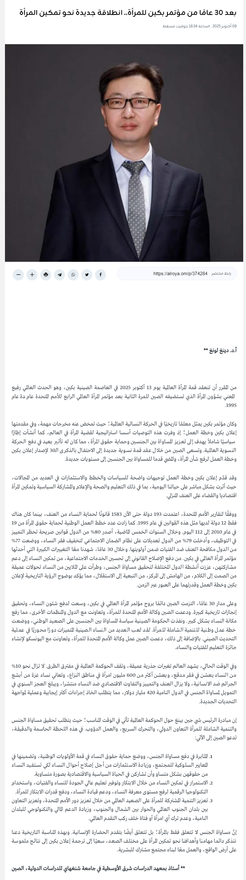 2025年10月8日,上外中东研究所丁隆教授在阿曼《观点报》发表评论文章“纪念北京世界妇女大会30周年:妇女赋权新起点”,全文如下: