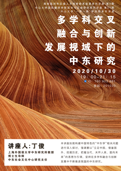 2020年10月30日,上外中东研究所丁俊教授应邀为中山大学国际翻译学院作了题为《多学科交叉融合与创新发展视域下的中东研究》的线上学术讲座,讲座由中山大学国际翻译学院区域与国别研究方向学科带头人陈杰教授主持,中大翻译学院刘利华老师对讲座作了点评总结。讲座就构建中国特色的“中东学”相关问题进行了深入讲解,强调要以“立足中国、借鉴国外,挖掘历史、把握当代,关怀人类、面向未来”的思想为指导,坚持在多学科交叉融合与创新发展中不断推进我国的中东研究。讲座结束后,丁俊教授还与参加讲座的师生进行了线上互动交流并回答了大家的提问。