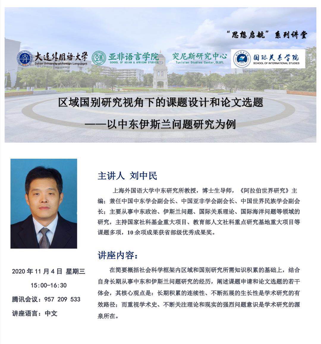 2020114日下午,上外中东研究所刘中民教授应邀为大连外国语大学作线上学术讲座,讲座题目为《区域国别研究视角下的课题设计和论文选题——以中东和伊斯兰问题研究为例》。讲座由大连外国语大学亚非学院副院长张婧姝博士主持,有100余人聆听了讲座。