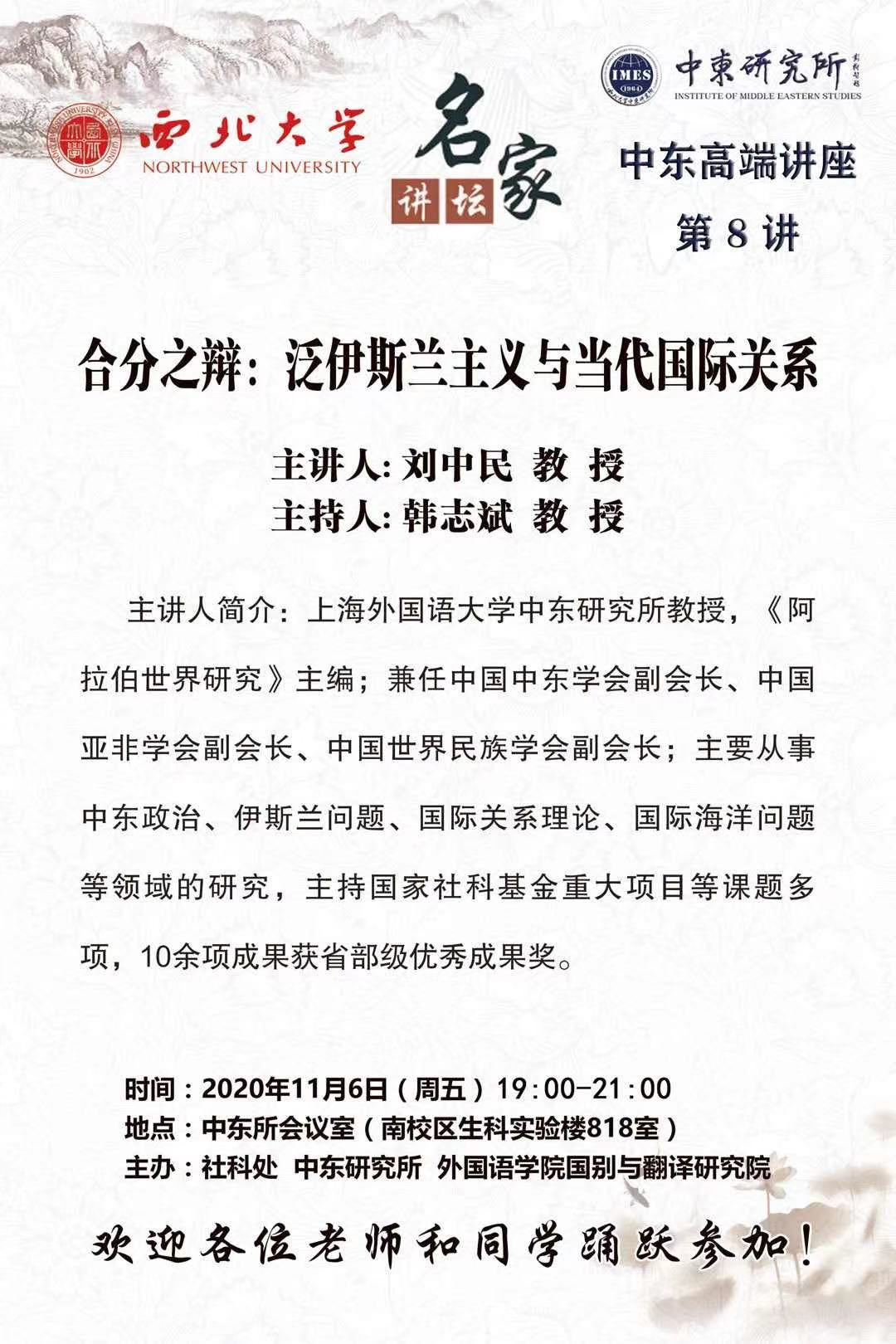 2020年11月6日,上外中东研究所刘中民教授应邀在西北大学中东研究所作学术讲座,讲座由西北大学中东研究所所长韩志斌教授主持。