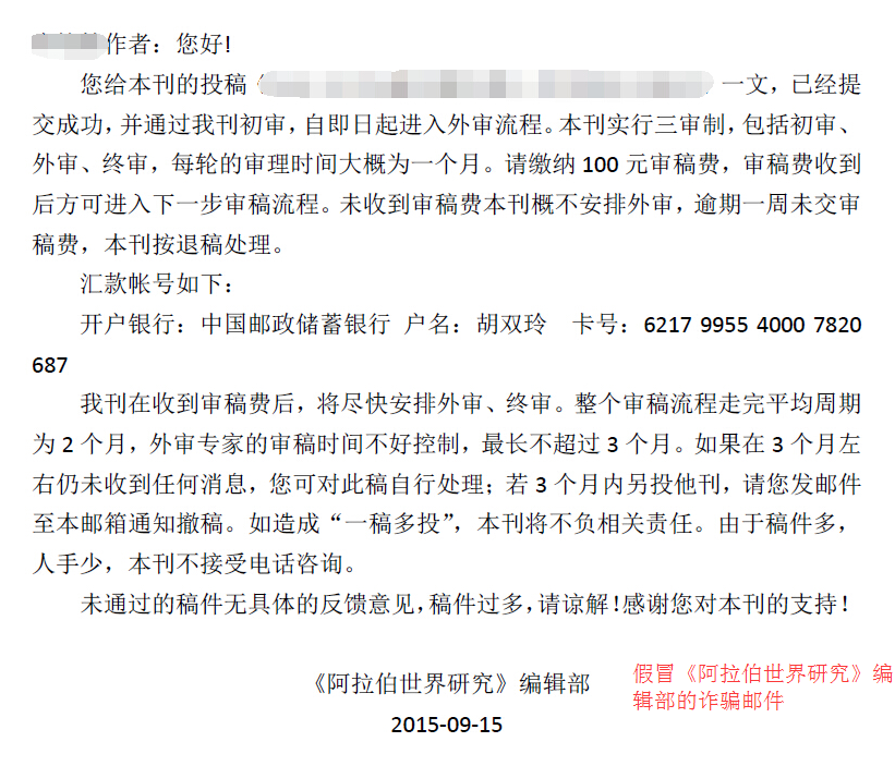 近日,网上出现了假冒《阿拉伯世界研究》的网站(http://www.albsjyj.cn),有不法人员以上海外国语大学中东研究所和《阿拉伯世界研究》编辑部的名义在网上进行征稿和欺诈活动,敬请各位审稿专家、编委、作者、读者及同行注意甄别,谨防受骗上当。(>>点击查看诈骗邮件)