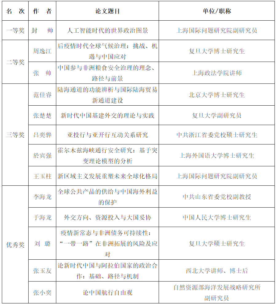 2020年12月10日,由上海市国际关系学会、上海国际问题研究院、浙江省桐乡市人民政府和文汇报联合主办的第十二届“金仲华国研杯”征文比赛颁奖仪式暨青年学者论坛在上海国际问题研究院举行。经过专家评议,上外中东研究所2020级博士研究生於宾强的论文《霍尔木兹海峡通行安全研究:基于突变理论模型的分析》获得本届征文比赛三等奖,是上海外国语大学在校参赛选手中的唯一获奖者。同时获奖的还有上外中东所2020届博士研究生张帅,现上海政法学院讲师,论文为《中国参与非洲粮食安全治理的理念、路径与前景》(二等奖),以及2019届博士研究生张玉友,现西北大学讲师、博士后,论文为《论新时代中国与阿拉伯国家的政治合作:基础、路径与机制》(优秀奖)。