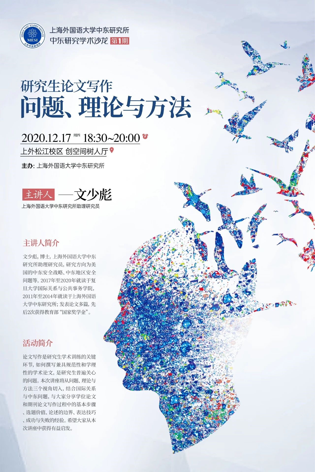 论文写作是研究生学术训练的关键环节,如何撰写兼具规范性和学理性的学术论文,是研究生普遍关心的问题。本次讲座将从问题、理论与方法三个视角切入,结合国际关系与中东问题,与大家分享学位论文和期刊论文写作过程中的基本步骤、选题价值、论述的边界、表达技巧、成功与失败的经验。希望大家从本次讲座中获得有益启发。
