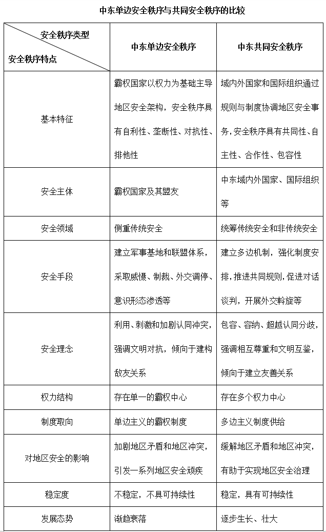 中东地区的共同安全秩序则是指中东域内外国家与地区组织、国际组织等行为体通过共同规则和制度安排,协调安全利益、管控冲突并应对共同威胁的一种新型地区安全秩序。在当代,中东尚未产生涵盖整个地区、合作机制成熟的共同安全秩序,但中国积极倡导全球安全倡议,主张“构建共同、综合、合作、可持续的中东安全架构”,这一秩序构想不仅适应了地区国家追求和平发展的历史潮流和现实需要,也为地区国家逐渐接受,而且在促进地区和解的实践中发挥了积极的建设性作用,进而为推动中东安全秩序的进化提供了充足动力。由此可见,两种不同的安全秩序具有本质的区别(见下表)。