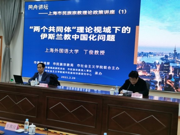 应上海市委统战部邀请,上外中东研究所所长丁俊教授于2021年2月26日在市社会主义学院凯旋校区作了题为“‘两个共同体’理论视域下的伊斯兰教中国化问题”的专题讲座。市委统战部副部长、市民族和宗教事务局党组书记王霄汉,市民族和宗教事务局局长花蓓、副局长杜宇平,市社会主义学院党组成员、副院长邬万里、马俊生、陆琦出席,讲座由市社会主义学院党组副书记、常务副院长毛大立主持。市委统战部有关处室干部、市民族和宗教事务局机关干部、市社会主义学院干部教师和有关单位工作人员以及市各区民宗办干部共120多人参加了讲座。本次讲座由市委统战部、市民族和宗教事务局、市社会主义学院主办,市委统战部民族宗教处、市民族和宗教事务局人事处、市社会主义学院城市民族和宗教研究中心承办,系“上海市民族宗教理论政策系列讲座”——“同舟讲坛”的第一讲。