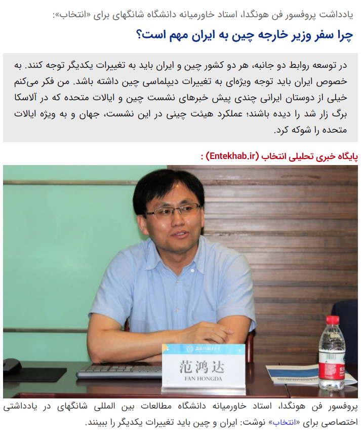 2021年3月26日,上外中东研究所范鸿达教授在伊朗著名媒体Entekhab发表评论文章《中国外长对伊朗的访问为什么重要?》。