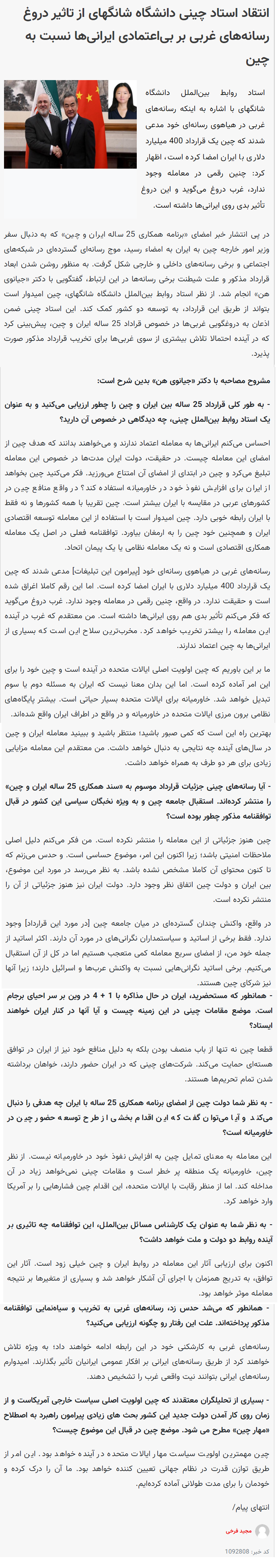 2021年4月14日,上外中东研究所韩建伟副教授就中伊关系接受伊朗ISCA通讯社专访,全文如下: