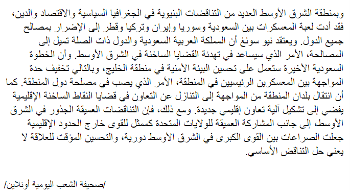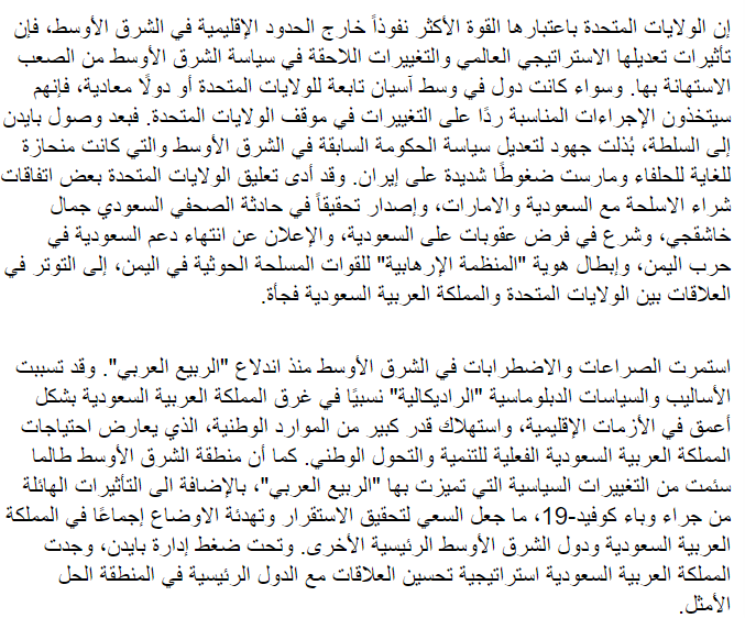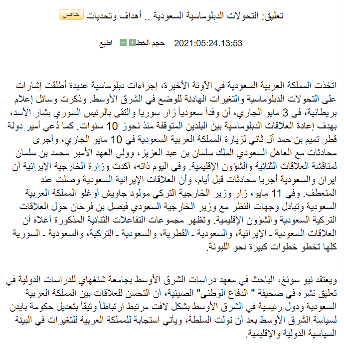 2021年5月24日,上外中东研究所钮松研究员的文章《沙特外交转型或推动中东局势回暖》(原载《中国国防报》2021年5月21日第4版)被人民网阿拉伯文版全文翻译转载,全文如下: