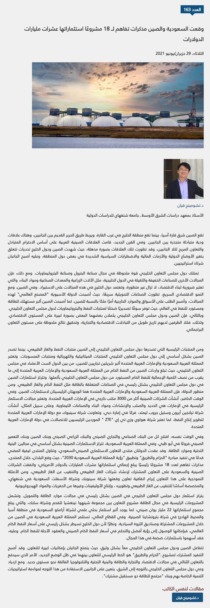 2021年6月29日,上外中东研究所潜旭明副研究员在《Araa Magazine》发表评论文章《中国-海合会国家能源合作与展望》,全文如下:
