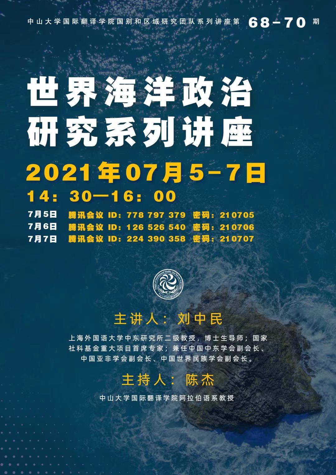 202175日至7日,上外中东研究所刘中民教授应邀为中山大学作《世界海洋政治研究》系列线上讲座, 三场讲座的题目分别是:《世界海洋政治研究的核心概念和代表性研究举要》《权力政治视角下的世界海洋政治》《权利政治(国际海洋法)视角下的世界海洋政治》,讲座由中山大学国际翻译学院陈杰教授主持。