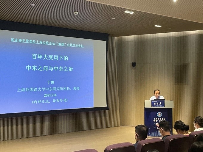 2021年7月8日,上外中东研究所所长丁俊教授应邀为国家移民管理局上海出入境边防检查总站作了题为《百年大变局下的中东之问与中东之治》的学术讲座。据悉,这是今年上外与上海边检总站签署合作协议后上外学者首次为总站作学术讲座。2021年6月2日,上海外国语大学与上海边检总站签署了合作共建协议,双方将在各相关领域开展务实合作,服务国家安全发展战略全局和总体外交大局。