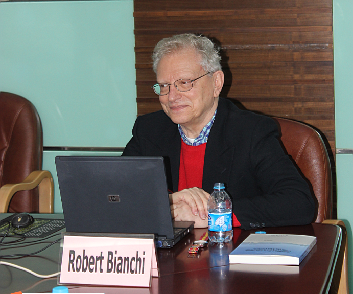 2016年3月22日下午,应中东研究所邀请,美国芝加哥大学教授、上外中东所富布莱特访问学者罗伯特•比安奇(Robert Bianchi)为我校师生作了题为“习近平主席中东之行及其影响”的专题讲座。讲座由孙德刚研究员主持中东所研究人员丁俊、余泳、钮松、潜旭明、包澄章、邹志强以及来自中东所、国研院和其他院系的师生聆听了讲座。
