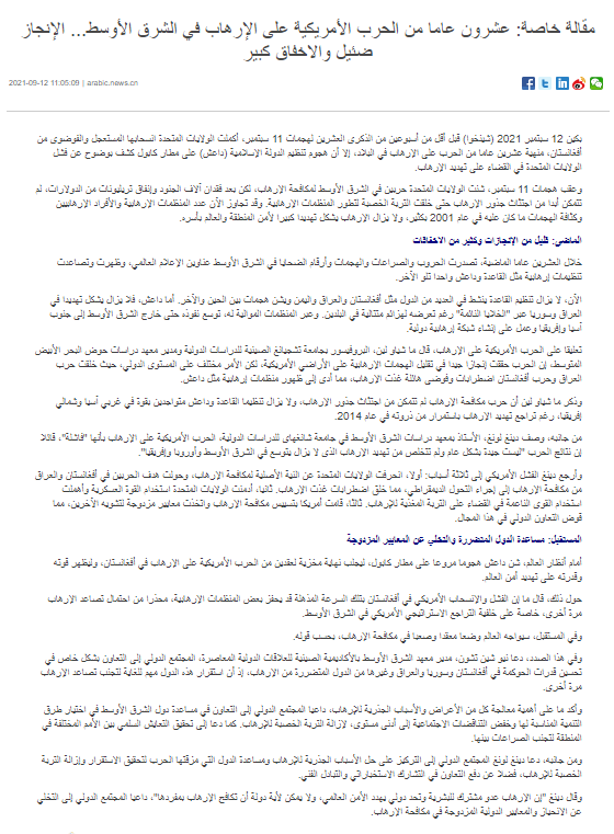 2021年9月12日,上外中东研究所丁隆教授就二十年来美国中东反恐战争接受新华社采访,全文如下: