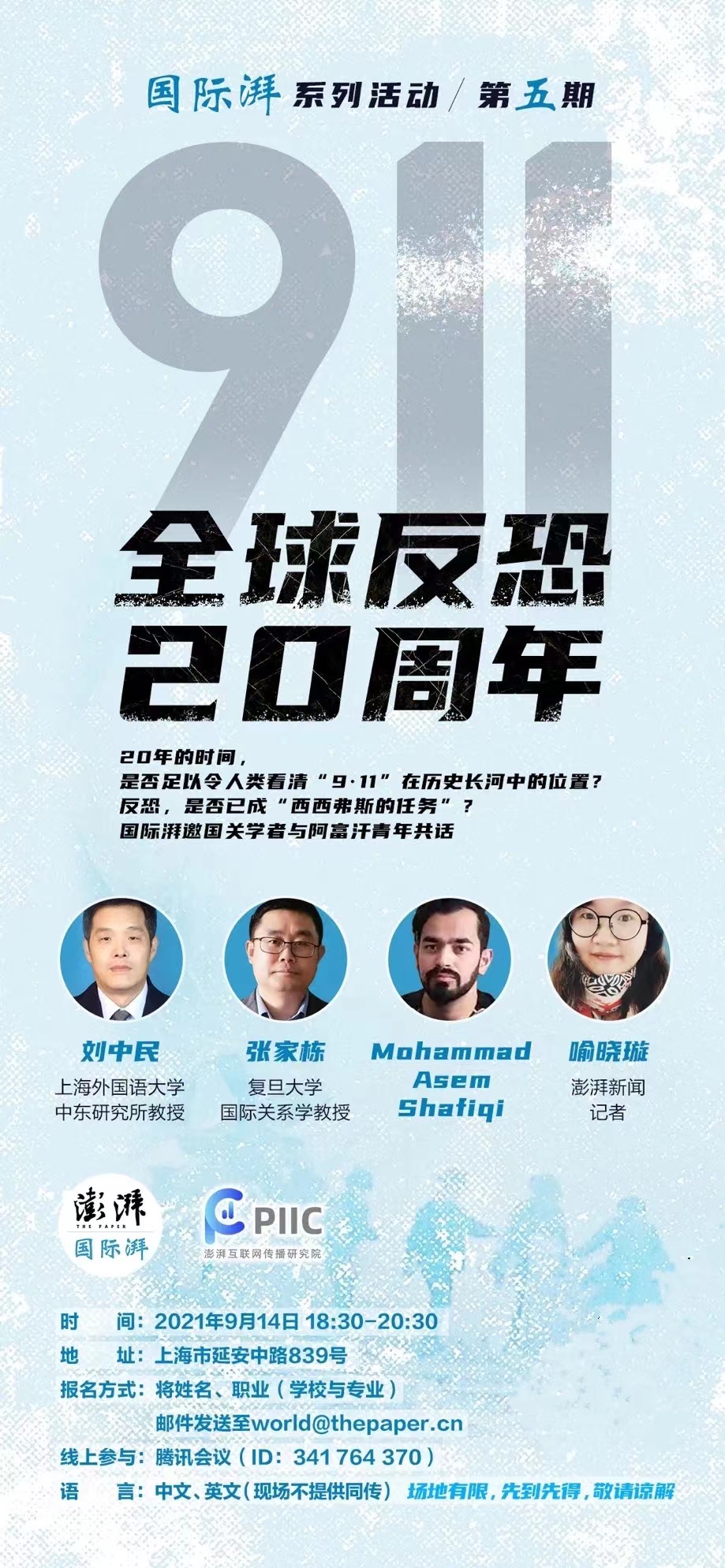 2021年9月14日晚上,澎湃新闻组织了“全球反恐20年”学术对话活动,上外中东研究所刘中民教授应邀参加。参加对话活动的其他嘉宾还包括复旦大学张家栋教授和在上海工作的阿富汗青年Mohammad Asem Shafiqi,对话活动的主持人为澎湃新闻记者喻晓璇。对话活动在澎湃新闻大楼举行,并通过腾讯会议进行线上直播。