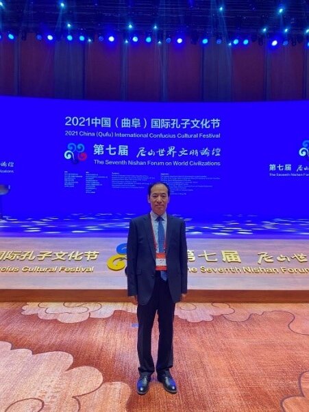 由教育部、文化和旅游部、国务院侨务办公室、中国社会科学院、中国人民对外友好协会、国际儒学联合会、山东省人民政府共同主办的2021中国(曲阜)国际孔子文化节暨第七届尼山世界文明论坛9月27日至28日在山东曲阜举行。全国人大常委会副委员长郝明金到会讲话并宣布开幕;中共中央政治局原委员、国务院原副总理、国际儒学联合会会长刘延东出席并讲话;尼山世界文明论坛组委会名誉主席、全国人大常委会原副委员长许嘉璐致贺信;山东省委书记刘家义在开幕式上致辞。泰国公主诗琳通、尼山世界文明论坛组委会名誉主席日本前首相福田康夫、菲律宾前总统阿罗约通过视频致辞;联合国前秘书长潘基文致贺信。来自几十个国家和地区的数百位中外嘉宾和专家学者出席论坛。论坛以“文明对话与全球合作”为主题,设有“全球抗疫中的文化力量”“文明多样性与世界融合发展”“全人类共同价值与构建人类命运共同体”等分论题。海内外专家学者在为期两天的时间里,围绕“文明对话与全球合作”这一主题,深入交流研讨,进行了30多场丰富多彩的学术活动。论坛首次设置了中医药论坛,还举行了联合国教科文组织孔子教育奖颁奖仪式、中外青年学生孔子文化周等活动。论坛闭幕式上发布了《第七届尼山世界文明论坛与会学者共识》;尼山世界文明论坛学术委员会副主任、中国人民大学原副校长杨慧林作了学术总结;山东省委副书记、省长李干杰出席并宣布闭幕。上外中东研究所所长丁俊教授应邀参加本次论坛,并在以“不同文明的分歧与融合”为主题的第六分组对话中做了题为“全球视域下的中阿(中国-阿拉伯)人文交流与命运共同体建设”的发言,还与北京大学郇庆治教授联合主持了以“儒家文明与人类共同命运”为主题的第七分组对话。