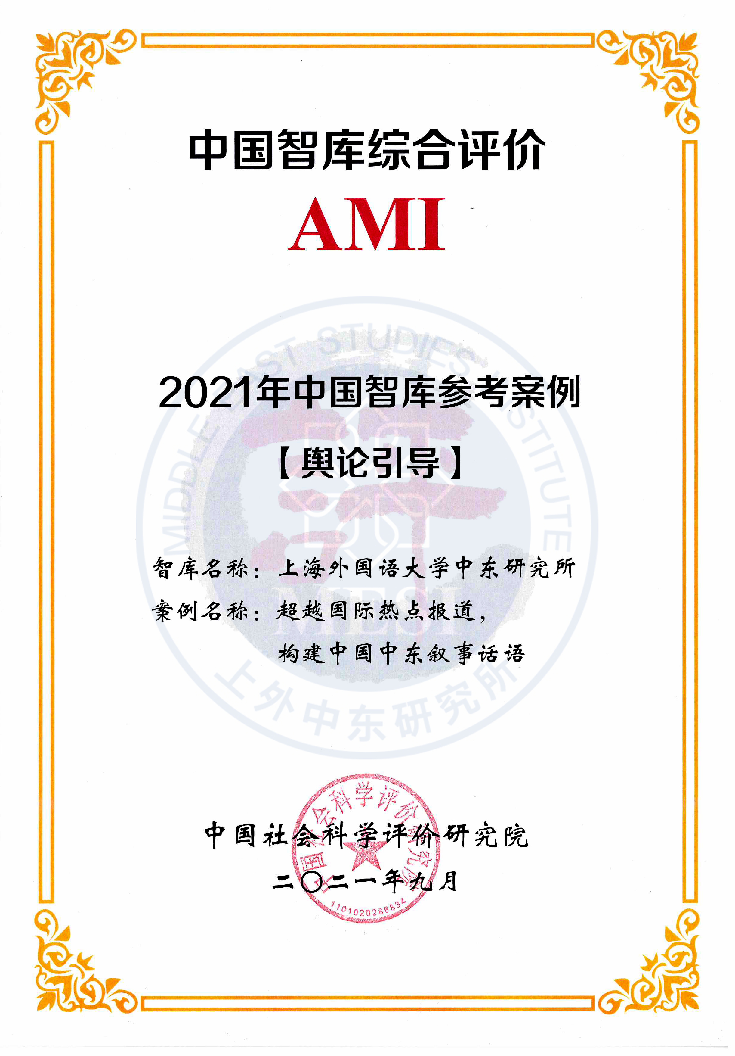 2021年9月28日,第四届中国智库建设与评价高峰论坛在北京举行,中国社会科学评价研究院在论坛上发布了《中国智库AMI综合评价研究报告(2021)》。上海外国语大学中东研究所申报的案例入选中国智库AMI综合评价参考案例。