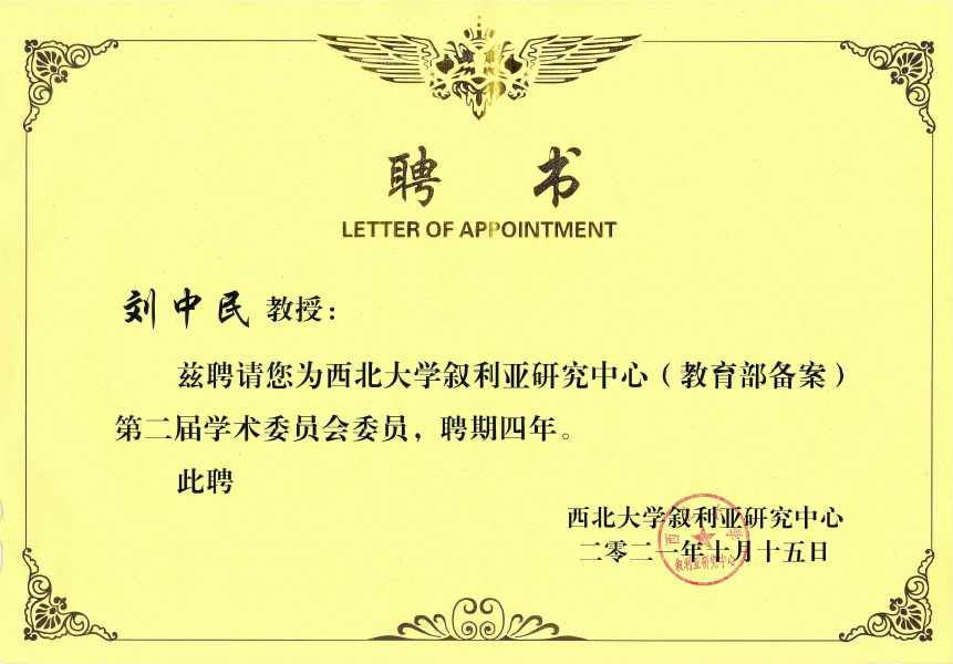 刘中民教授再次被西北大学叙利亚研究中心聘为学术委员会委员