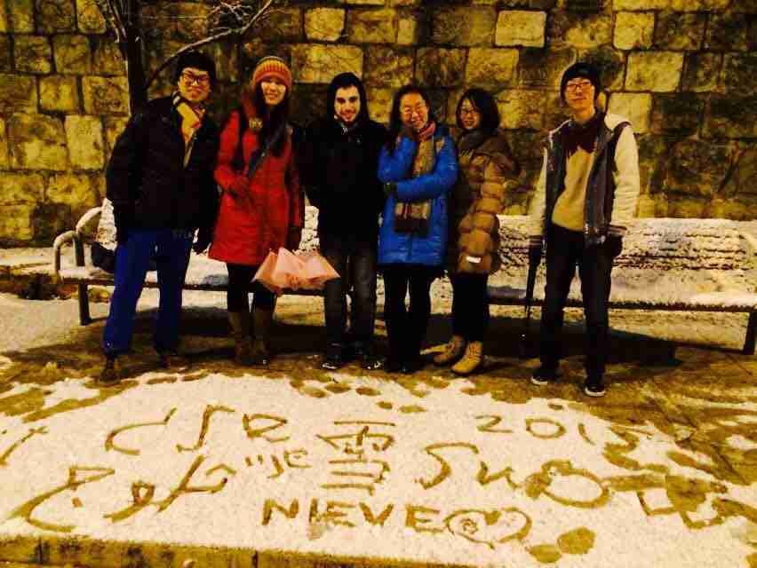 找了一块还未有人涉足的洁白雪地,大家疯了一般用各种语言写“雪”这个词,仿佛任何语言都没法描述出“雪”这个词的真正含义,那么柔软、那么温柔,在你不经意间就给你一个惊喜。想起《红楼梦》中的几句诗词:“沁梅香可嚼,淋竹醉堪调。或湿鸳鸯带,时凝翡翠翘。无风仍脉脉,不雨亦潇潇。”这里没有腊梅,不然准会拉着欧美以及拉美小伙伴用红纸剪点什么然后高高的挂起来,不过细想来,这里有雪覆金顶,这里有知心好友,而我又近在其中,倒也是知足了。