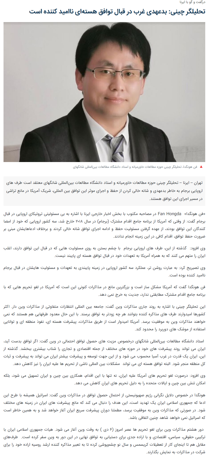 2021年12月27日,上外中东研究所范鸿达教授就伊核协议谈判接受伊朗国家通讯社(IRNA)专访,全文如下:
