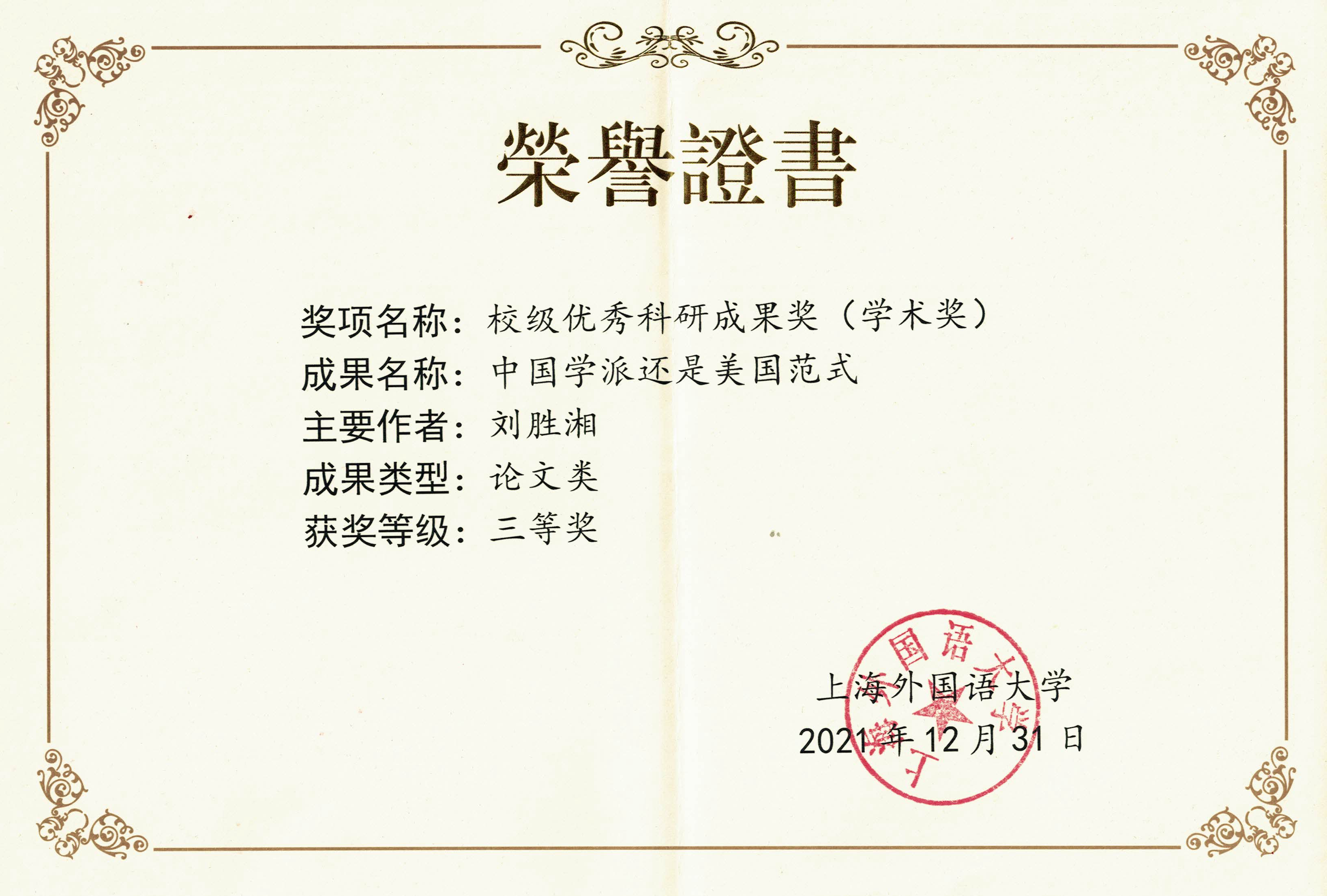 根据《上海外国语大学优秀科研成果奖评奖暂行办法》,在严格执行评奖相关制度和规定的前提下,经个人自由申报、院系初审、专家复审、校科学研究委员会终审、主管校领导审批和获奖成果公示,中东研究所刘胜湘教授撰写的《中国学派还是美国范式》获2021年度优秀科研成果学术奖(论文类)三等奖。