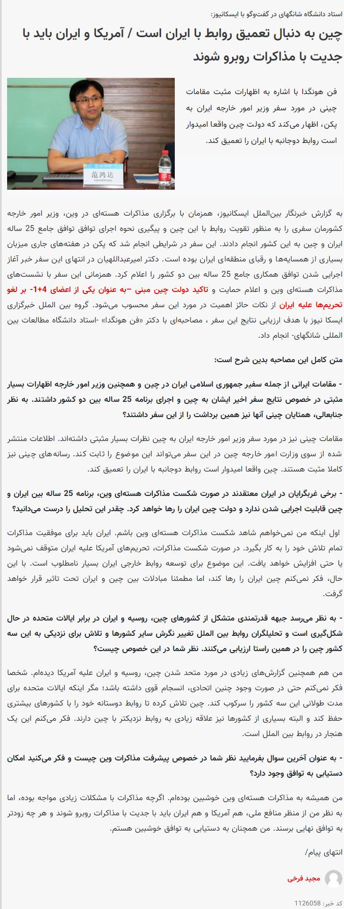2022年1月17日,上外中东研究所范鸿达教授就伊朗外长访华和维也纳JCPOA谈判接受伊朗ISCA通讯社专访,同日采访被伊朗法尔斯通讯社转载,全文如下: