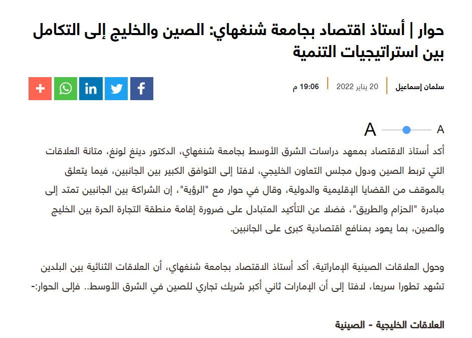 2022年1月18日,上外中东研究所丁隆教授就海湾国家外长访华与中海合作接受阿联酋主流媒体《观点报》(Alroeya)专访(见Alroeya2022年1月18日第15版),全文如下: