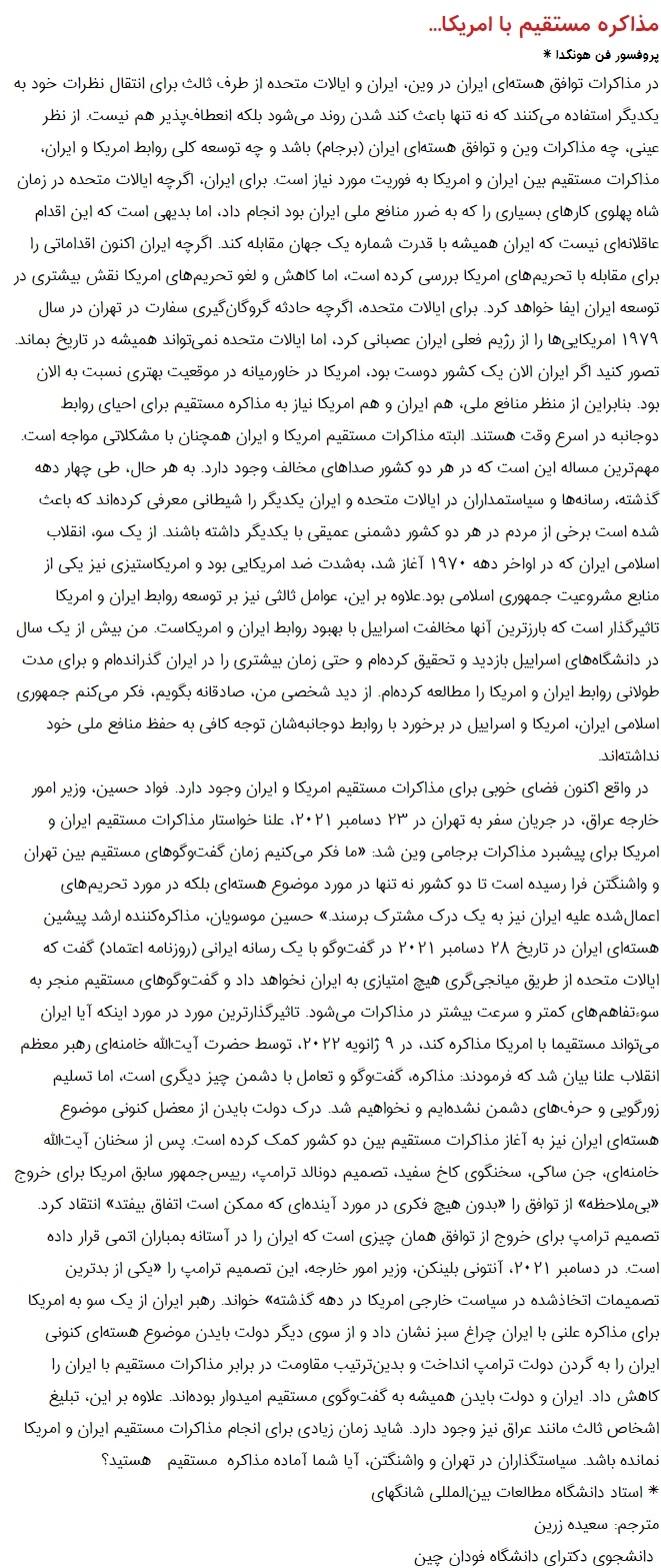 2022年1月23日,上外中东研究所范鸿达教授在伊朗Etemaad报发表评论文章《与美国直接谈判》(见Etemaad 2022年1月23日第1、2版),全文如下: