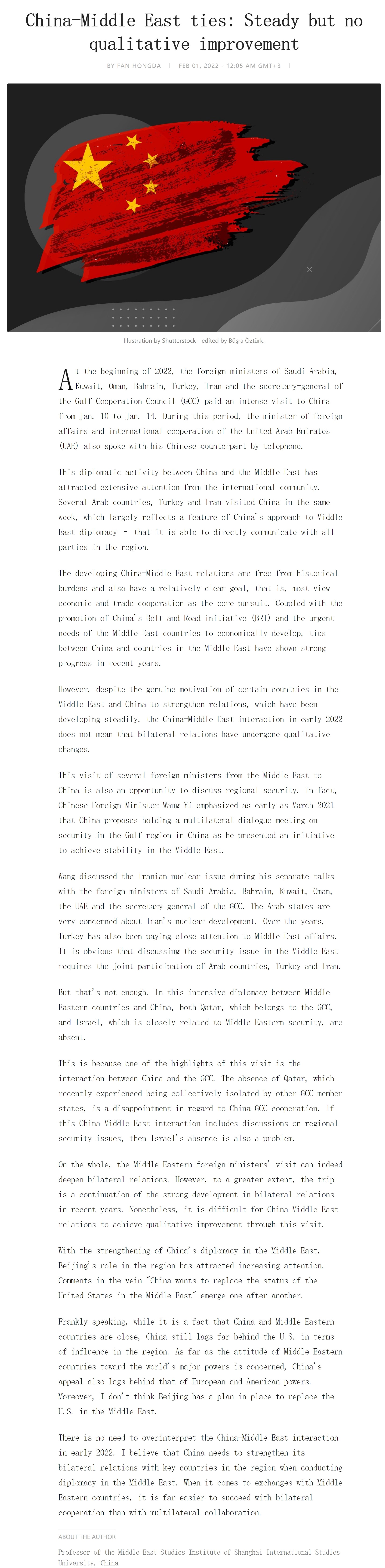2022年2月1日,上外中东研究所范鸿达教授在土耳其 Daily Sabah发表评论文章“China-Middle East ties: Steady but no qualitative improvement”,全文如下: