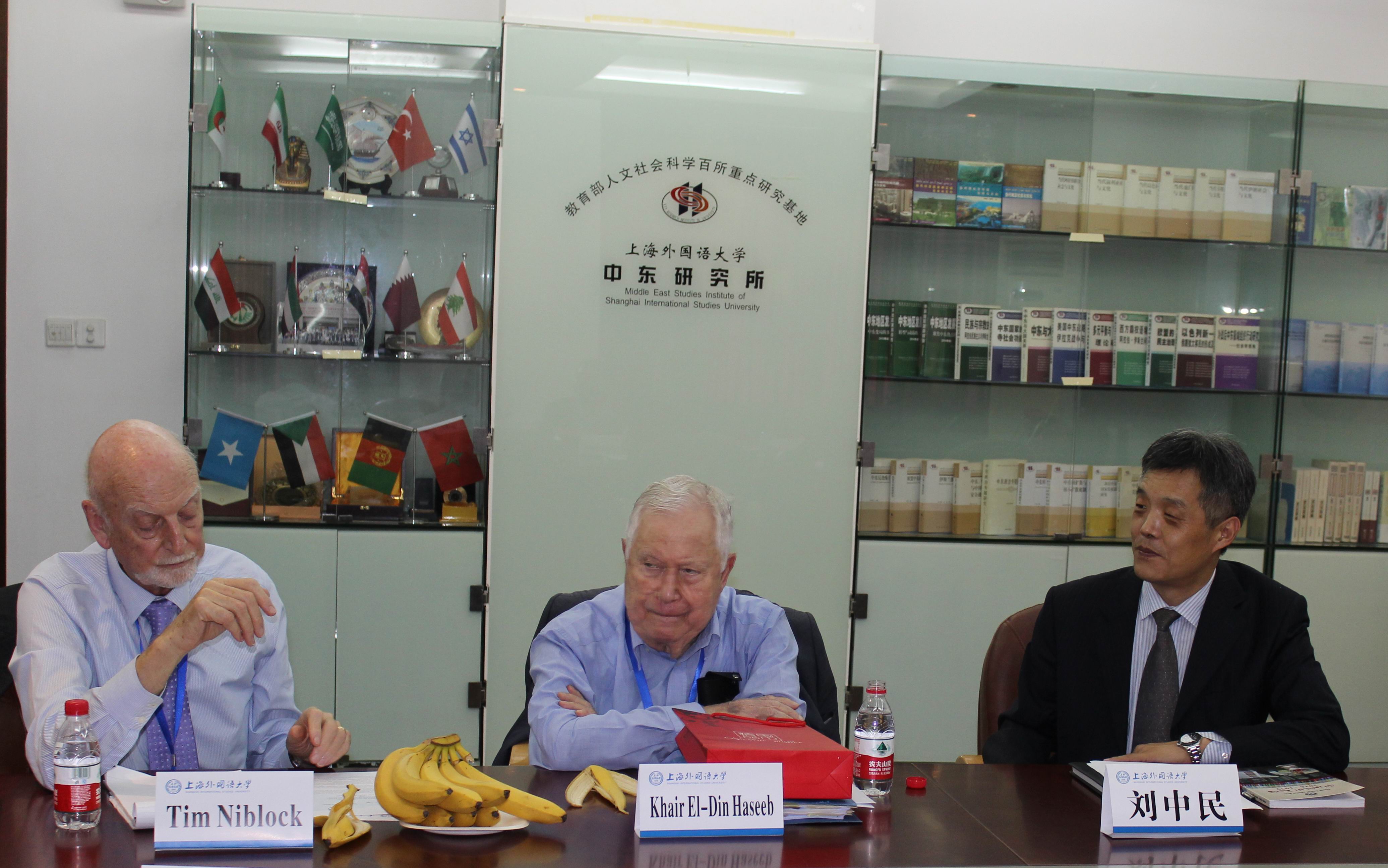 2016年9月25日下午,阿拉伯统一研究中心主任哈伊尔丁·哈希卜(Khair El-Din Haseeb教授)、萨阿德·贾瓦德(Saad N. Jawad)教授,黎巴嫩阿拉伯翻译组织总干事海瑟姆·纳希(Haitham G. Alnahi)教授,苏丹学研究中心(喀土穆)加法尔·艾哈迈德(Gaafar K. Ahmed)教授,英国埃克塞特大学现代阿拉伯与伊斯兰研究所蒂莫西·尼布洛克(Timothy C. Niblock)教授一行访问上外中东研究所,并同中东所研究人员举行会谈。