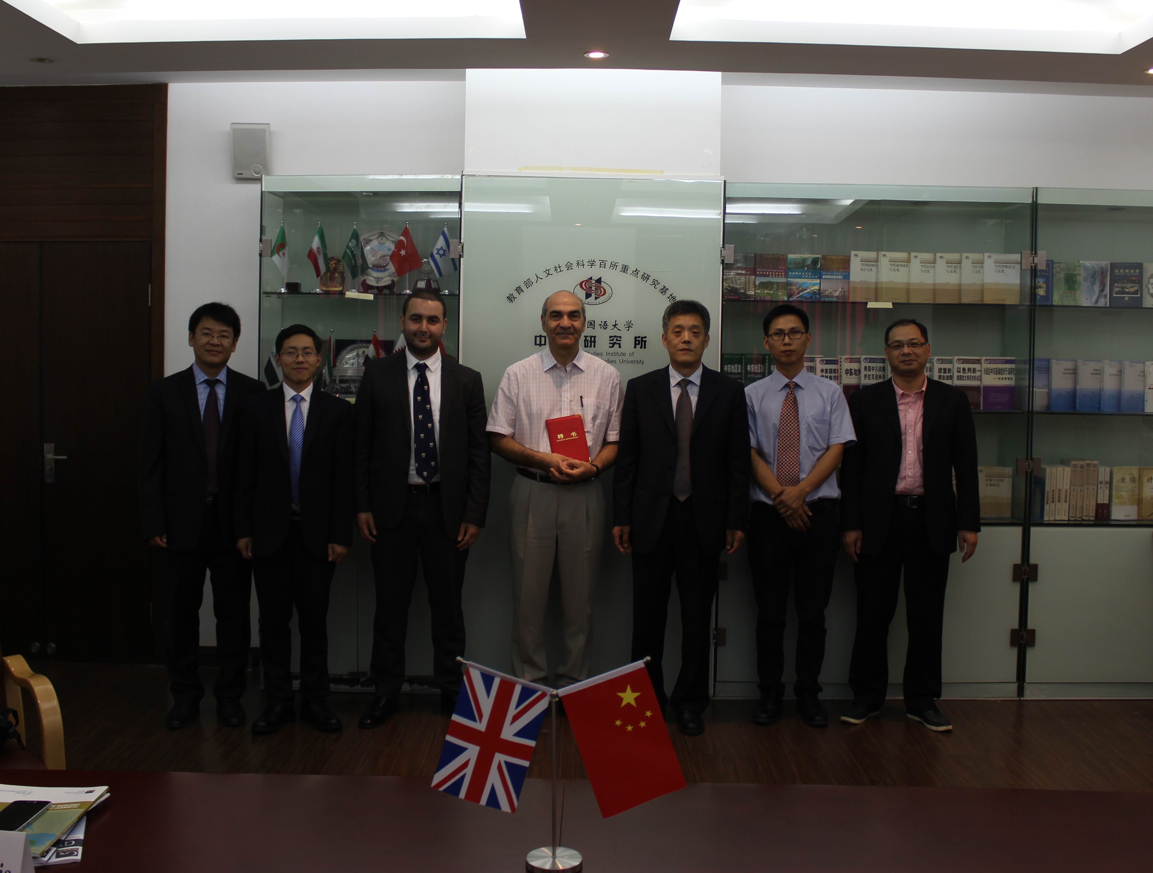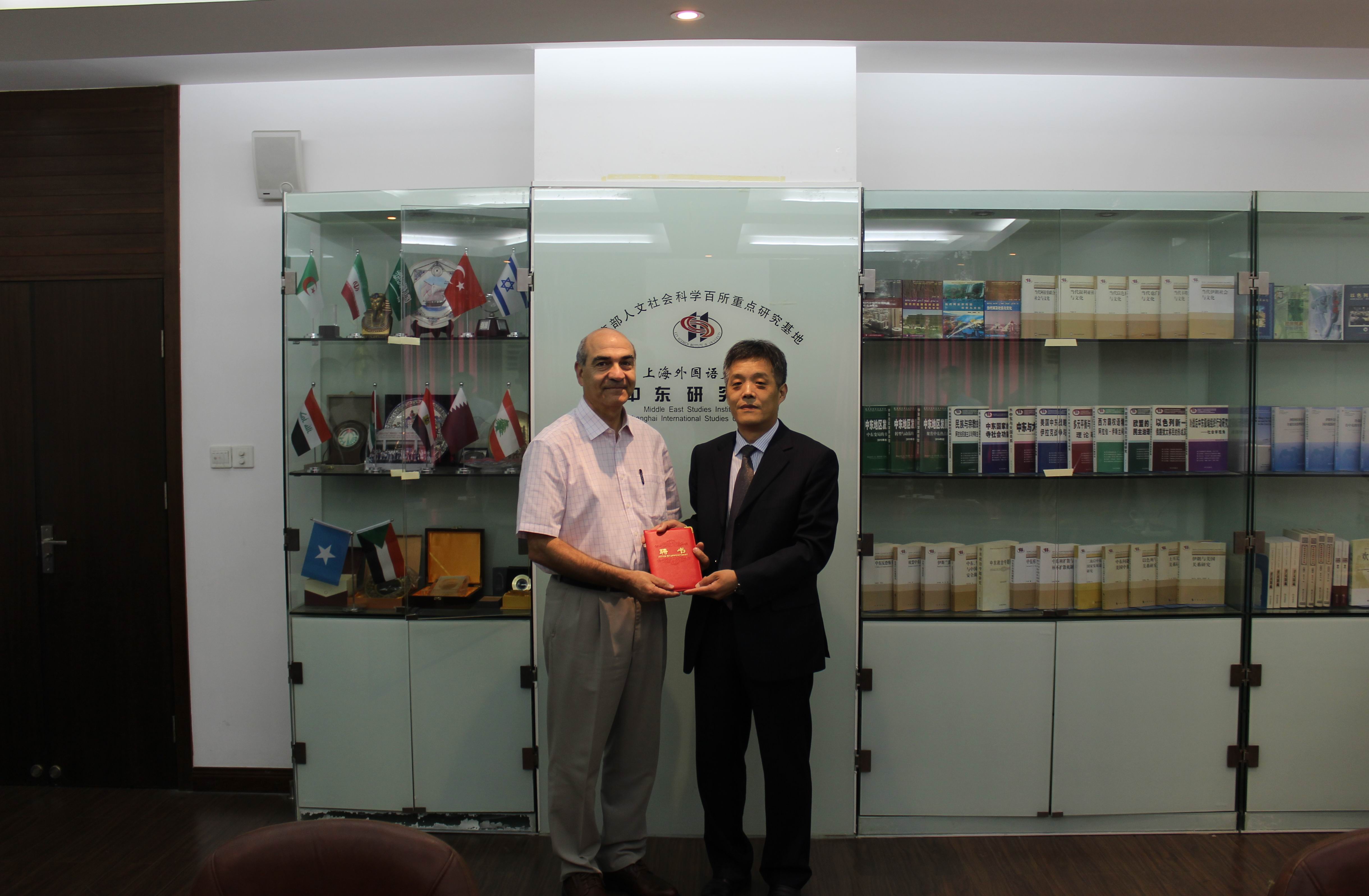 2016年9月25日下午,中东研究所举行国际荣誉顾问聘书颁发仪式。中东研究所所长刘中民教授为哈桑•哈基米安(Hassan Hakimian)教授颁发了中东研究所国际荣誉顾问聘书。中东研究所孙德刚、赵军、包澄章、邹志强、潜旭明等出席了哈基米安教授聘书颁发仪式。