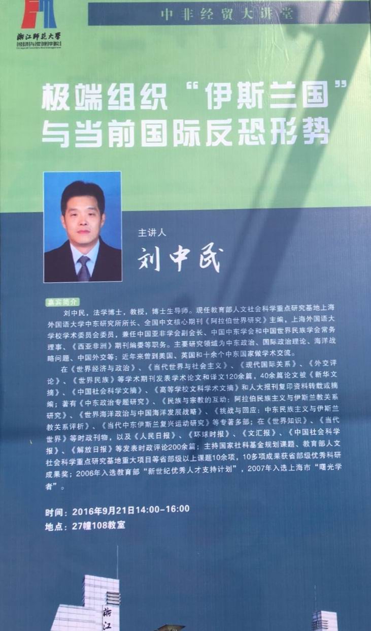 2016年9月21日,应浙江师范大学中非国际商学院的邀请,中东研究所所长刘中民教授为“中非经贸大讲堂”作学术报告,报告题目为《极端组织“伊斯兰国”与当前国际反恐形势》。讲座由中非国际商学院国际经济与贸易系郑小勇副主任主持。