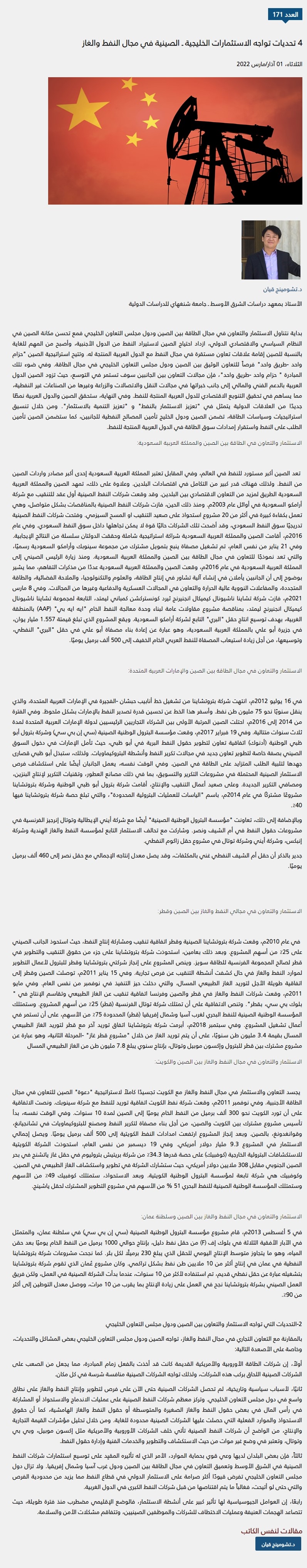 2022年3月1日,上外中东研究所潜旭明副研究员在《Araa Magazine》发表评论文章《中国-海湾国家油气合作与挑战》,全文如下: