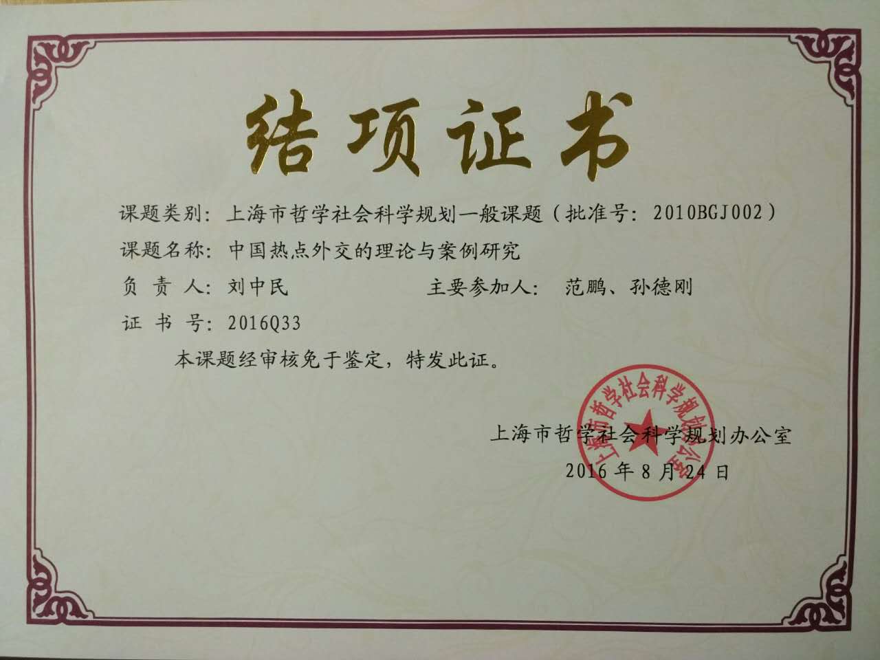 近日,中东研究所刘中民教授主持的上海市社科规划课题“中国热点外交的理论与案例研究”以免于鉴定的方式结项,证书编号:2016Q33。该课题主要参加人为范鹏博士和孙德刚研究员。