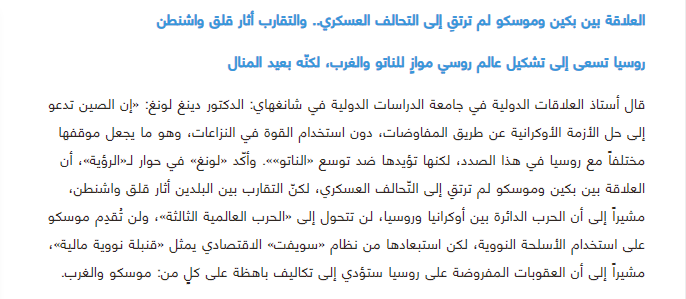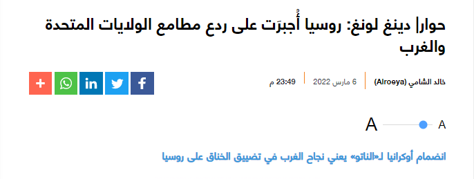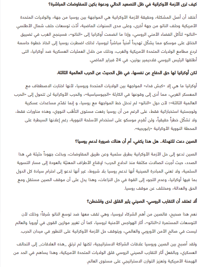 2022年3月7日,上外中东研究所丁隆教授就中国对俄乌冲突的立场接受阿联酋主流媒体《观点报》(Alroeya)专访(见Alroeya2022年3月7日第18版),全文如下: