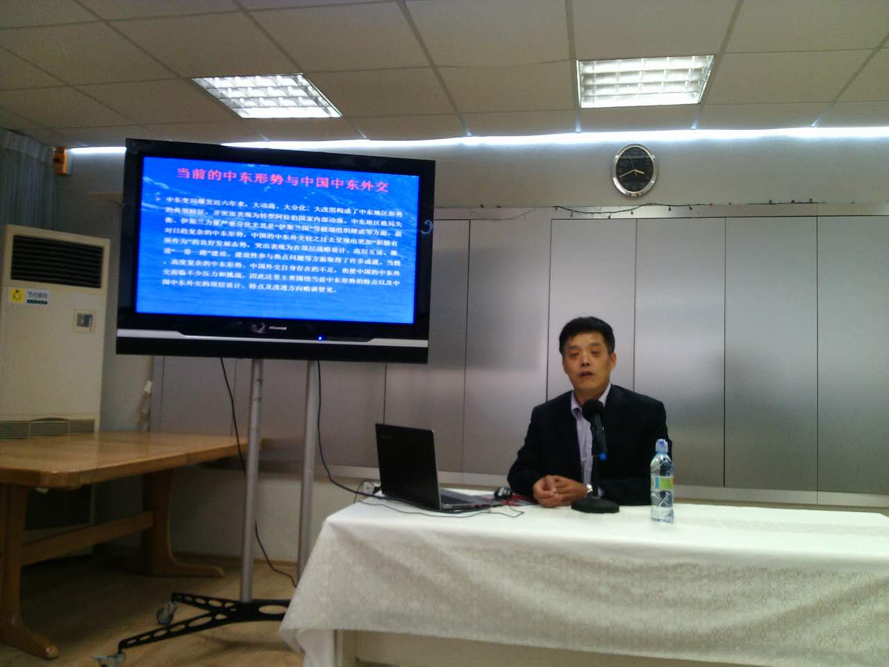 会谈结束后,上外中研究所所长刘中民教授应邀为使馆30余名外交官作了题为《当前的中东形势与中国中东外交》的学术报告,并就现场提问进行了详细解答。两个多小时的讲座在热烈的讨论中结束。
