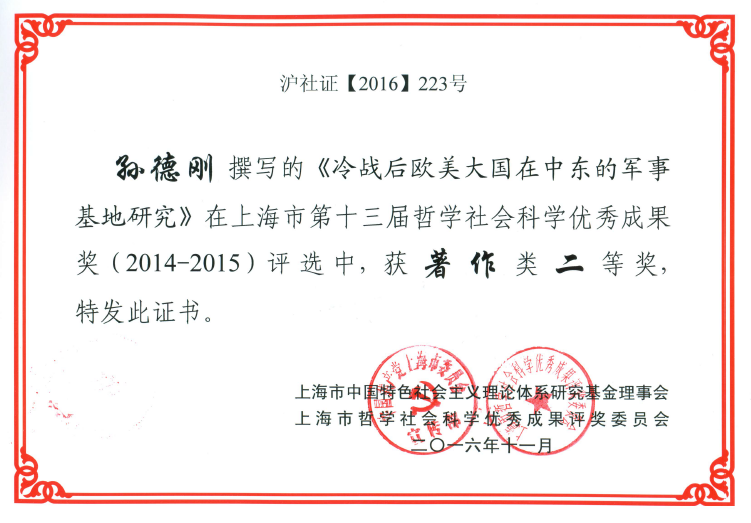 孙德刚研究员撰写的《冷战后欧美大国在中东的军事基地研究》获上海市第十三届哲学社会科学优秀成果(2014—2015)著作类二等奖。大会还宣布了“上海年度社科新人(2016)”评选结果,中东研究所孙德刚研究员获得2016年度“上海年度社科新人”称号。