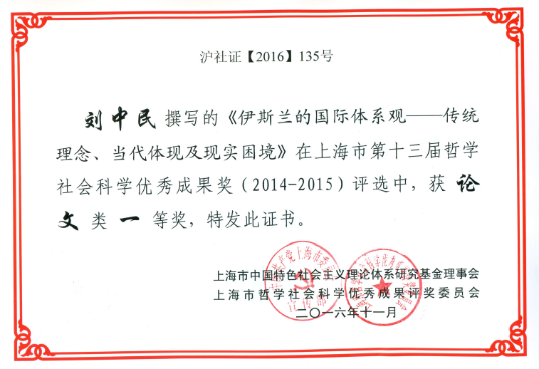 大会宣布了上海市第十一届中国特色社会主义理论体系研究和宣传优秀成果、上海市第十三届哲学社会科学优秀成果奖项。上外中东研究所刘中民教授撰写的《伊斯兰的国际体系观——传统理念、当代体现及现实困境》获上海市第十三届哲学社会科学优秀成果(2014—2015)论文类一等奖。