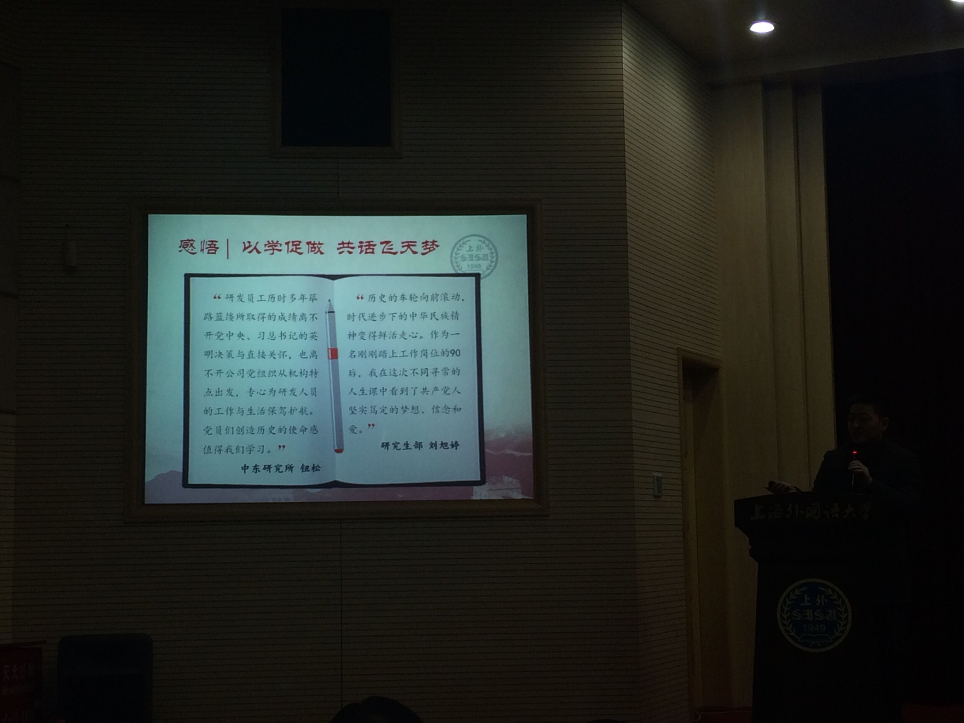 2016年11月25日,上海外国语大学2016年“两优一先”表彰会暨党务工作能力培训班结业典礼在虹口会议中心第一报告厅举行,研究院总支中东所支部书记钮松副研究员作为“校优秀共产党员”上台接受表彰。曹德明校长出席会议并作了“两学一做”学习教育专题党课。