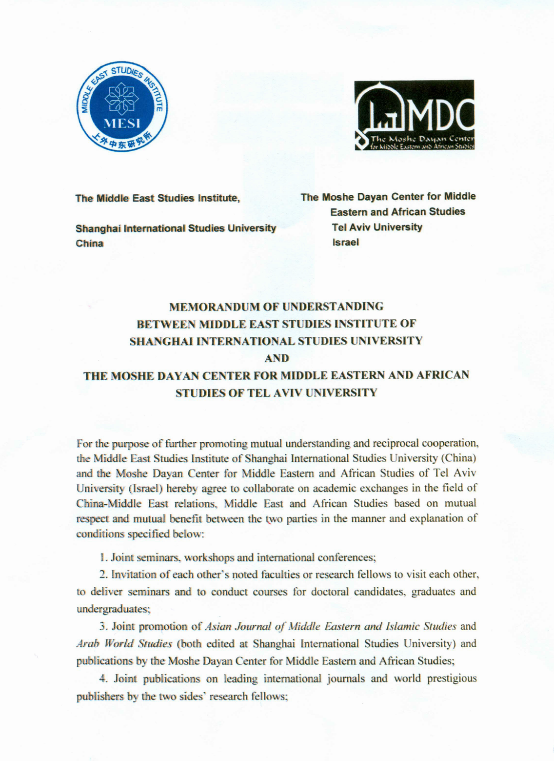 摩西·达扬中东与非洲研究中心于1965年成立,是致力于研究当代中东与非洲地区政治、安全和社会等事务的以色列智库,中心依靠特拉维夫大学雄厚的研究实力,长期为以色列政府决策提供智力支持。上外中东所和摩西·达扬中心近年来科研合作密切,师生交流频繁,2008年和2016年,摩西·达扬中心和上外中东所分别派代表团访问对方研究机构,深化了双边科研和学术交流。