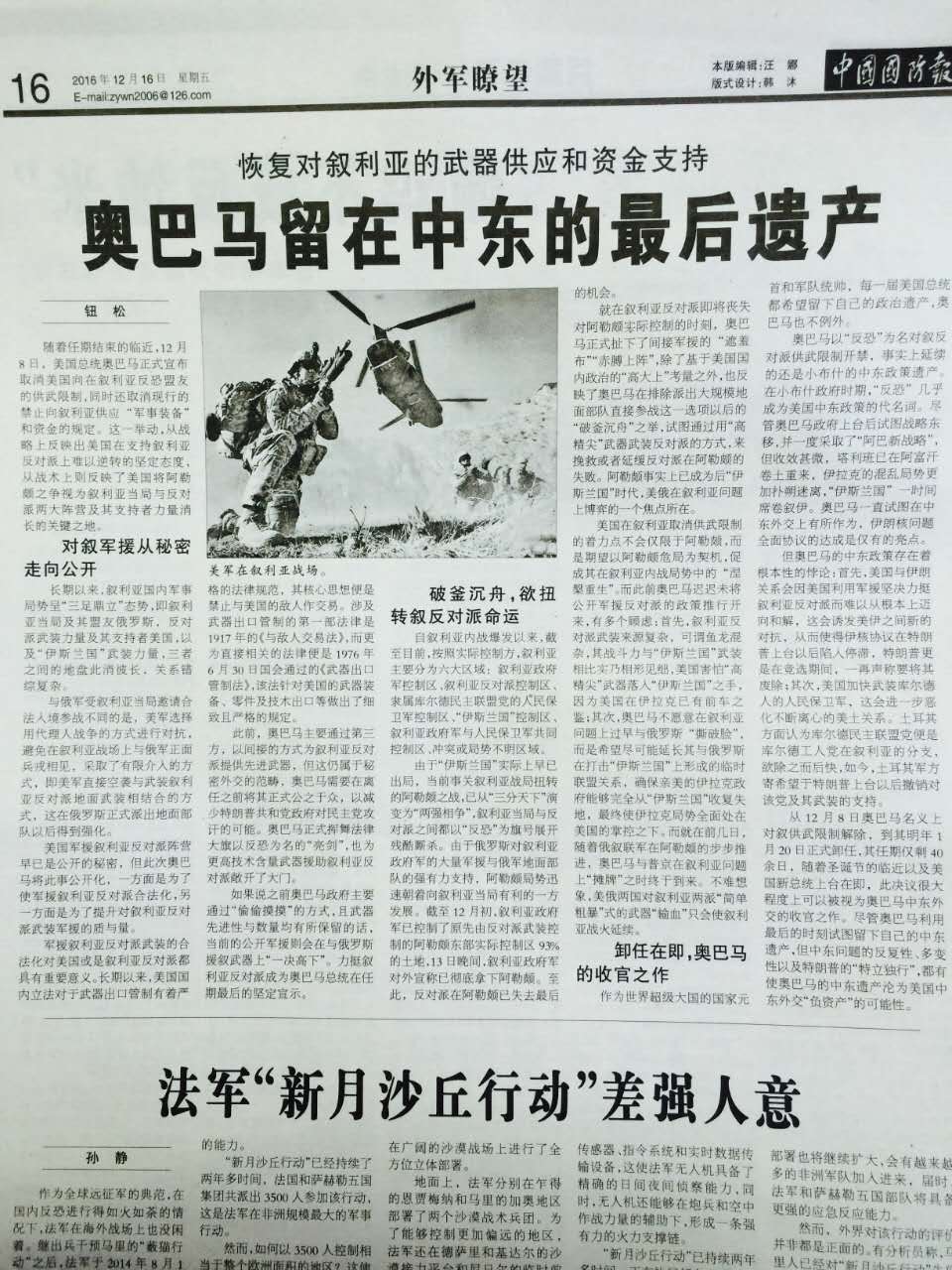 2016年12月16日,中东研究所钮松副研究员在《中国国防报》发表评论文章《奥巴马留在中东的最后遗产》(见《中国国防报》2016年12月16日第16版),全文如下: