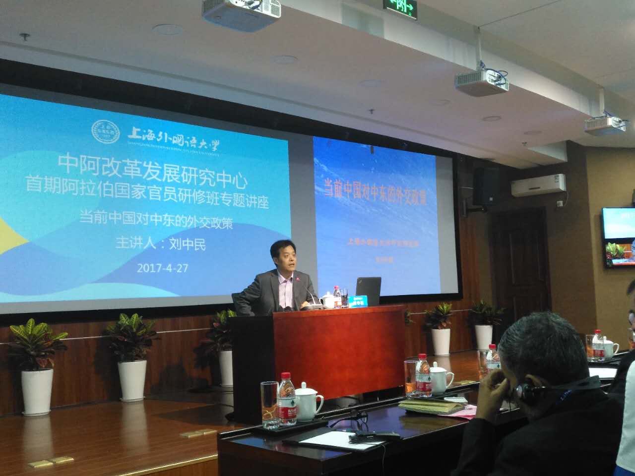 2017年4月27日,刘中民教授为上海外国语大学中阿改革与发展研究中心的阿拉伯官员研修班授课。讲授的题目为“中国对中东的外交政策”。刘中民教授讲述的内容主要包括:对中东概念的简要说明;中国与中东国家关系的简要回顾;中国对主要中东问题的外交政策;《中国对阿拉伯国家政策文件》解读;中国对中东外交政策的特点;对如何改进中国中东外交的若干思考。来自17个阿拉伯国家的20多位司局级官员聆听了讲座,刘中民教授还就中阿关系、巴勒斯坦问题、叙利亚问题、利比亚问题等热点问题回答了阿拉伯官员的提问。
