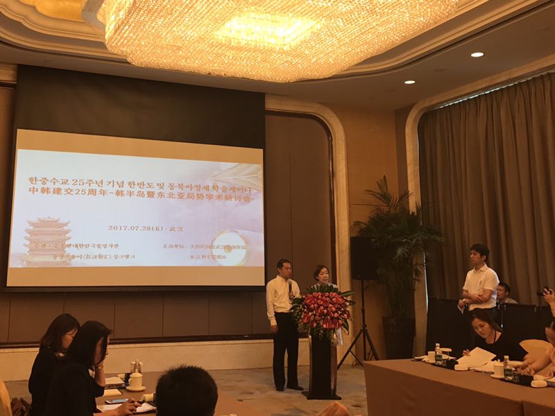 “中韩建交25周年——半岛暨东北亚局势学术研讨会”于2017年7月28日在武汉万达瑞华酒店举行。韩国驻武汉总领事郑裁男致辞,主要来自韩国国家安保战略研究所、韩国东国大学、韩国亚洲大学的学者和国内的一些青年学者。刘胜湘教授应邀参加会议,并就中韩关系和半岛局势问题与学者们进行了交流。刘胜湘的发言题目是中美关系背景下韩国的角色问题。刘胜湘首先就韩国学者提出的希望中韩相互理解的观点提出了自己的看法,认为中韩相互理解是合理的,但就在韩国部署萨德系统而言,中国是受害者一方,如何让受害者去理解施害者一方?这是难以理解的。
