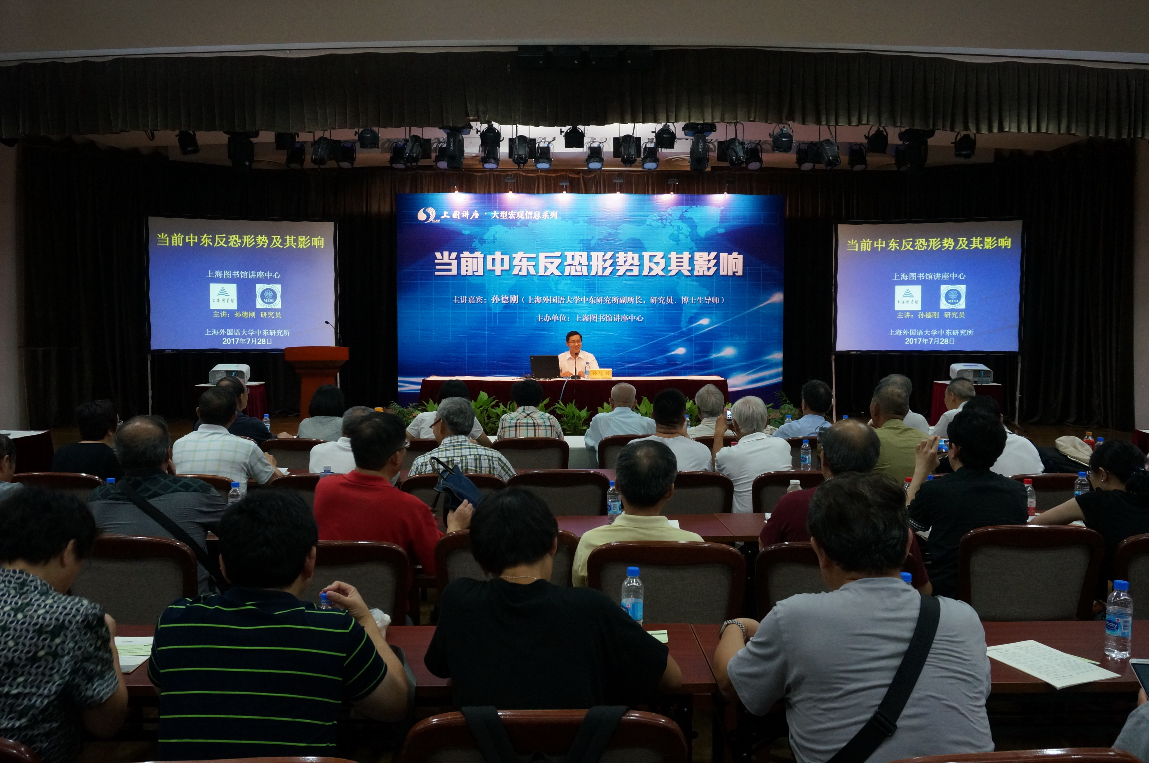 2017年7月28日,应上海图书馆讲座中心的邀请,上外中东研究所孙德刚研究员为上图讲座中心正式会员300多人作了题为“当前中东反恐形势及其影响”的专题讲座。讲座分为五大部分:一、中东恐怖主义概述;二、重点案例:“伊斯兰国”组织研究;三、国际社会在中东的反恐行动;四、中东恐怖主义的地区与全球影响;五、中东恐怖主义与中国中东外交。