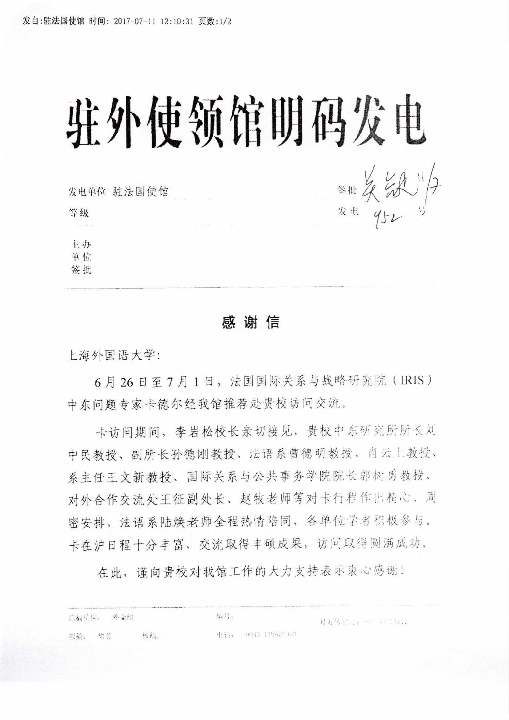 近日,中国驻法国大使馆致函上海外国语大学,对6月26日至7月1日法国国际关系与战略研究院(IRIS)中东问题专家阿卜杜·拉希姆(Abdelkader Abderrahim)研究员访问上外期间,李岩松校长、中东研究所刘中民所长、孙德刚副所长等学者的热情接待和大力支持表示衷心感谢。