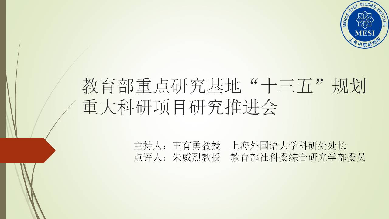 活动的第三场是在下午召开的“教育部重点研究基地‘十三五’规划重大科研项目研究推进会”。会议由上海外国语大学科研处处长王有勇教授主持,中东研究所学术委员会成员参加评议,教育部社会科学委员会综合研究学部委员朱威烈教授进行点评。