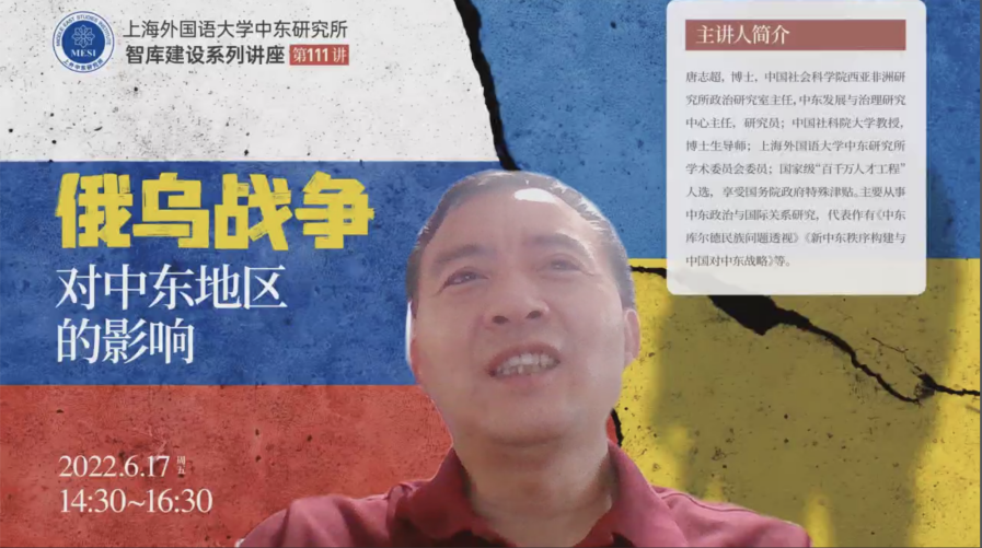 2022年6月17日下午,上海外国语大学中东研究所“智库建设系列讲座”第111讲在线举行,中国社会科学院西亚非洲研究所政治研究室主任、上外中东研究所学术委员会委员唐志超研究员应邀作了题为“俄乌战争对中东地区的影响”学术讲座。